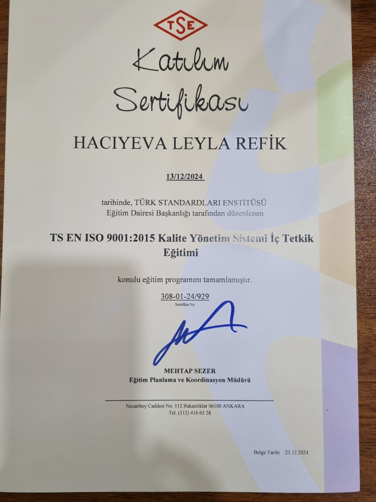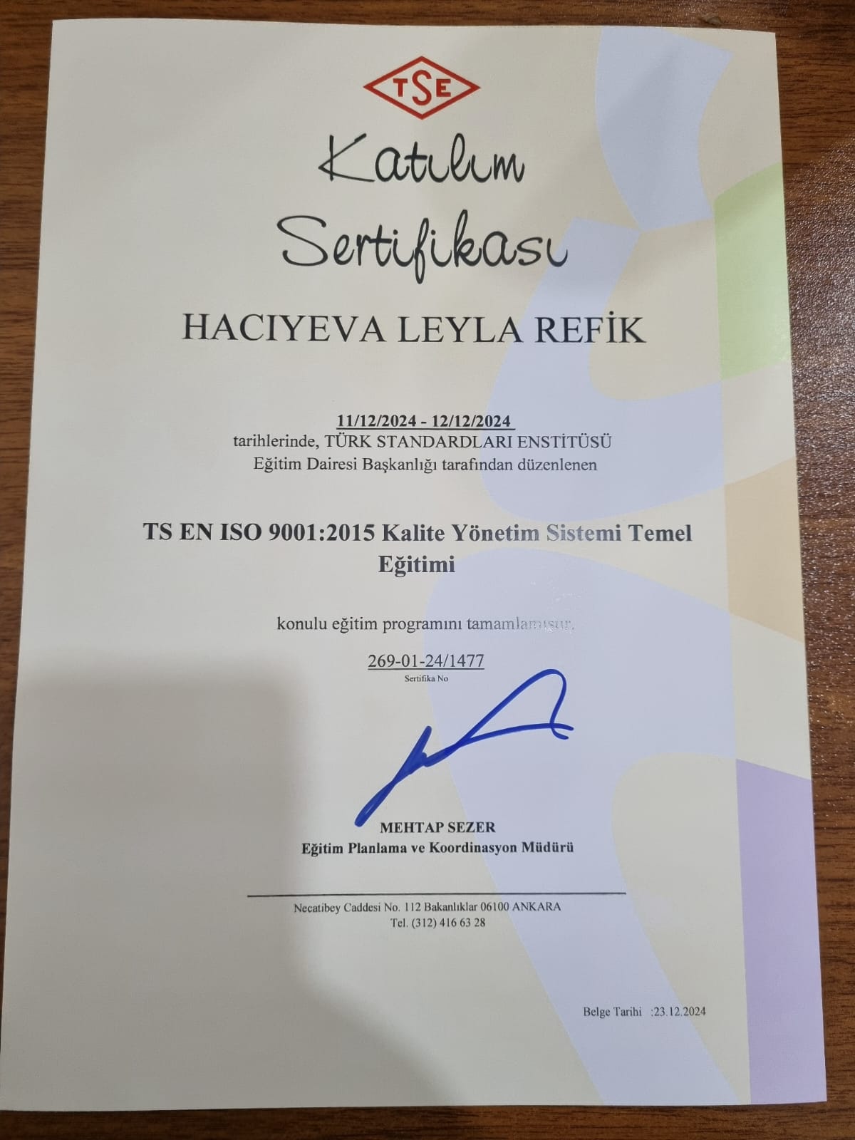 2022-ci ildə Soft Skills, 2024-cü ildə TS EN İSO 9001: 2015 Kalite Yönetim Sistemi Temel Eğitimi və TS EN İSO 9001: 2015 Kalite Yönetim Sistemi İç Tetkik Eğitimi – təlimlərində iştirak edib sertifikatlar əldə etmişdir.