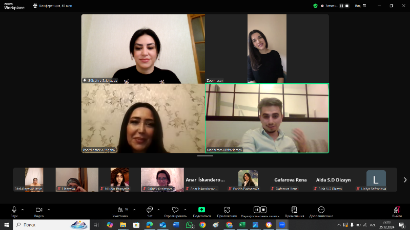 Sonda “Dizayn” kaferdasının baş müəllimi Gülçöhrə Salehzadə dizayn sahələrindəki aktual məsələlərdən danışaraq, məzunları maraqlandıran suallara cavab verib, tələbə və məzunlara təhsil və karyeraları ilə bağlı tövsiyələr veriblər.
