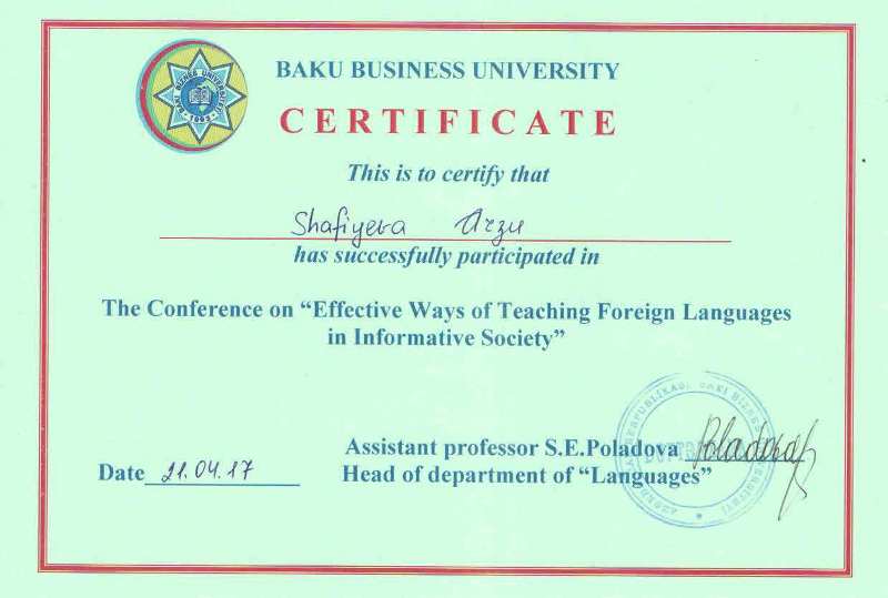 “English on commercial studeies” adlı dərs vəsaitinin, 5 sertifikatın və 11 elmi məqalənin müəllifidir.