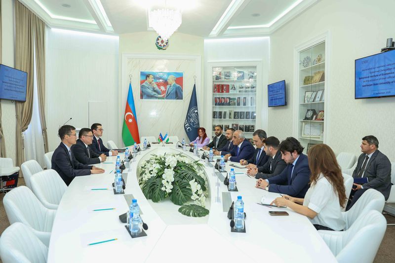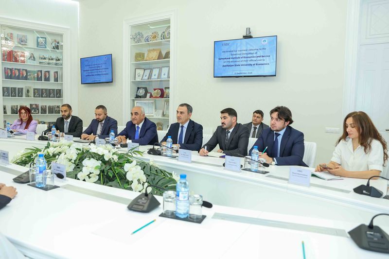 To this end, a delegation led by professor Muhiddin Egamberdiyevich Pulatov, rector of Samarkand University of Economics and Service, visited UNEC. The meeting was attended by UNEC rector professor Adalat Muradov, relevant university department heads, and the Uzbek delegation.